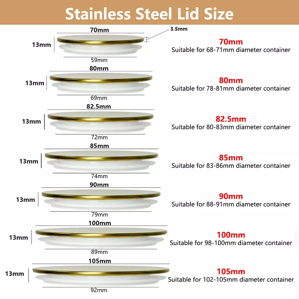 Ons schermafdrukken van roestvrijstalen kaarsenpotdeksels zijn verkrijgbaar in verschillende maten, allemaal met een totale hoogte van 13 mm. De specifieke dimensies en compatibele containeropeningen worden hieronder weergegeven: